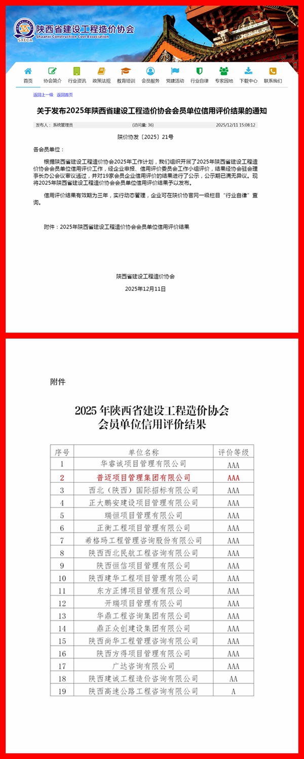 2025年12月11日,陕西省建设工程造价协会发布《关于发布2025年陕西省建设工程造价协会会员单位信用评价结果的通知》,普迈项目管理集团有限公司在2025年陕西省建设工程造价协会会员单位信用评价中荣获AAA级!