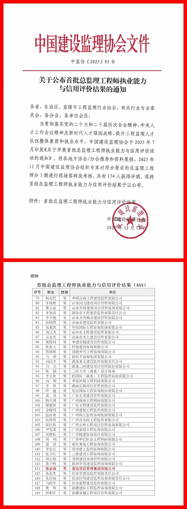 2025年12月11日,中国建设监理协会发布《关于公布首批总监理工程师执业能力与信用评价结果的通知》,公司张必成同志光荣上榜,荣获AAA级评价!该等级为此次评价体系中的最高等级,首批共有174人获得评级,其中124人获评AAA级,43人获评AA级,7人获评A级,陕西省仅2人获评AAA级,张必成同志即为其中之一,充分体现了中国建设监理协会对其个人执业能力与信用水平的权威认可!