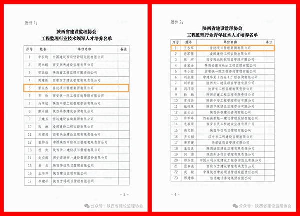 3月12日,陕西省建设监理协会正式公布了工程监理行业领军人才和青年人才培养对象名单。公司董事长景亚杰凭借深厚的专业功底、丰富的项目管理经验以及对行业发展的突出贡献,成功入选技术领军人才培养名单。副总经理王永军则以扎实的技术功底和卓越的青年骨干素质,入选青年技术人才培养名单。两位核心骨干的同时入选,充分彰显了公司在人才梯队建设和技术创新方面的雄厚实力,也体现了行业对公司综合能力的高度肯定。
